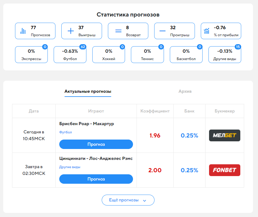 Помимо личной статистики автора, есть еще статистика по прогнозам, попавшим в категорию "Железные" и "Лучшие по отзывам пользователей".