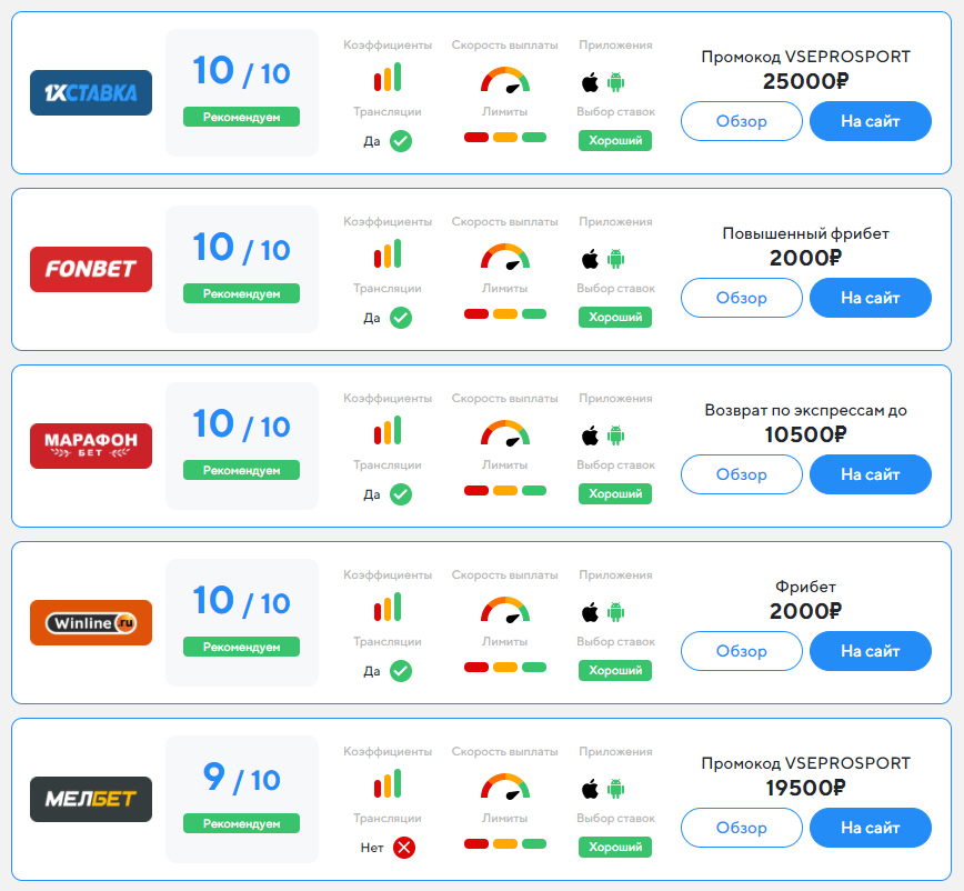 Это отдельный раздел, созданный для помощи новичкам в выборе букмекера. Рейтинг представлен в виде таблицы с названиями букмекеров. Каждой конторе присвоены баллы по 10 бальной шкале. Администрация оценивала участников по таким критериям: